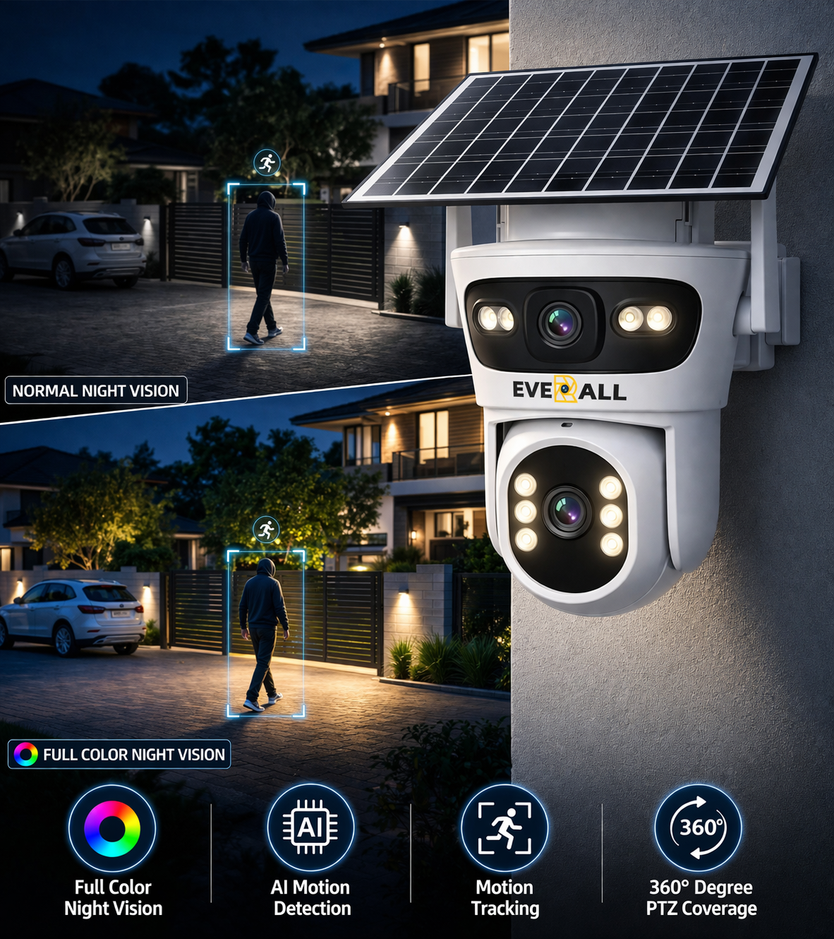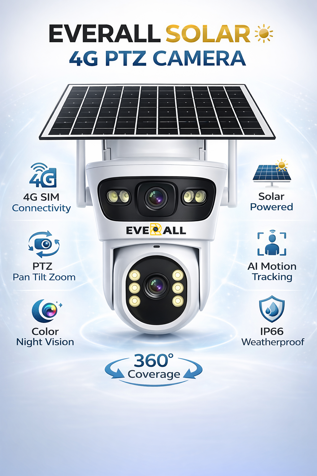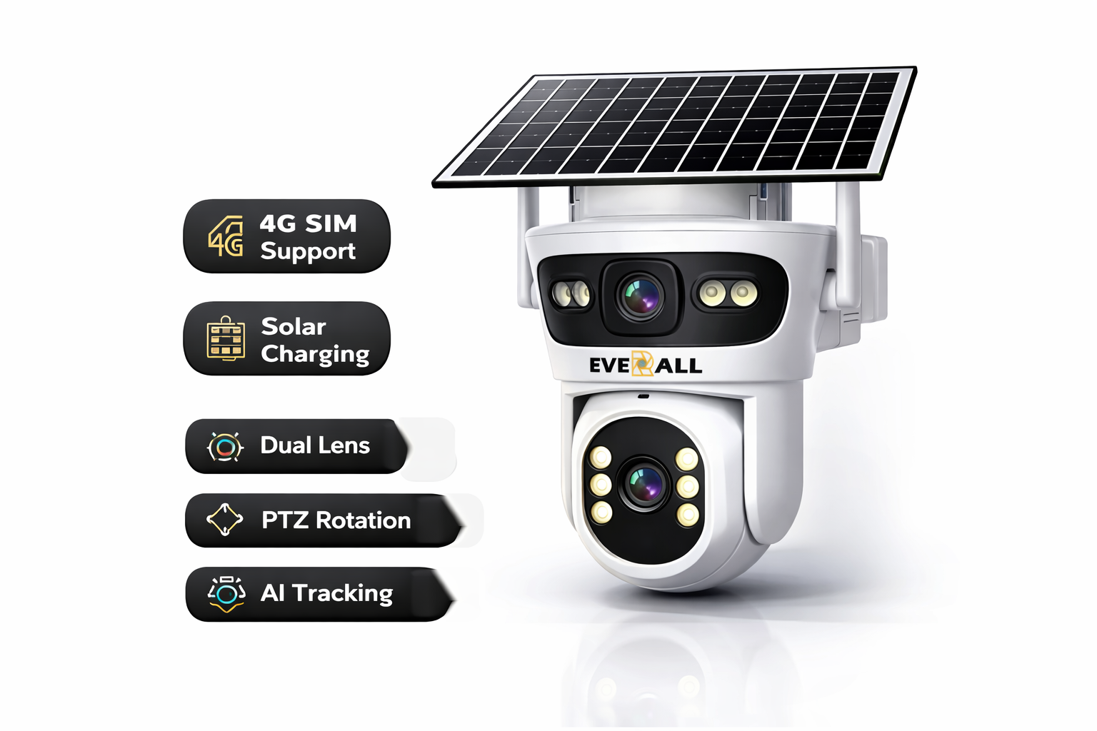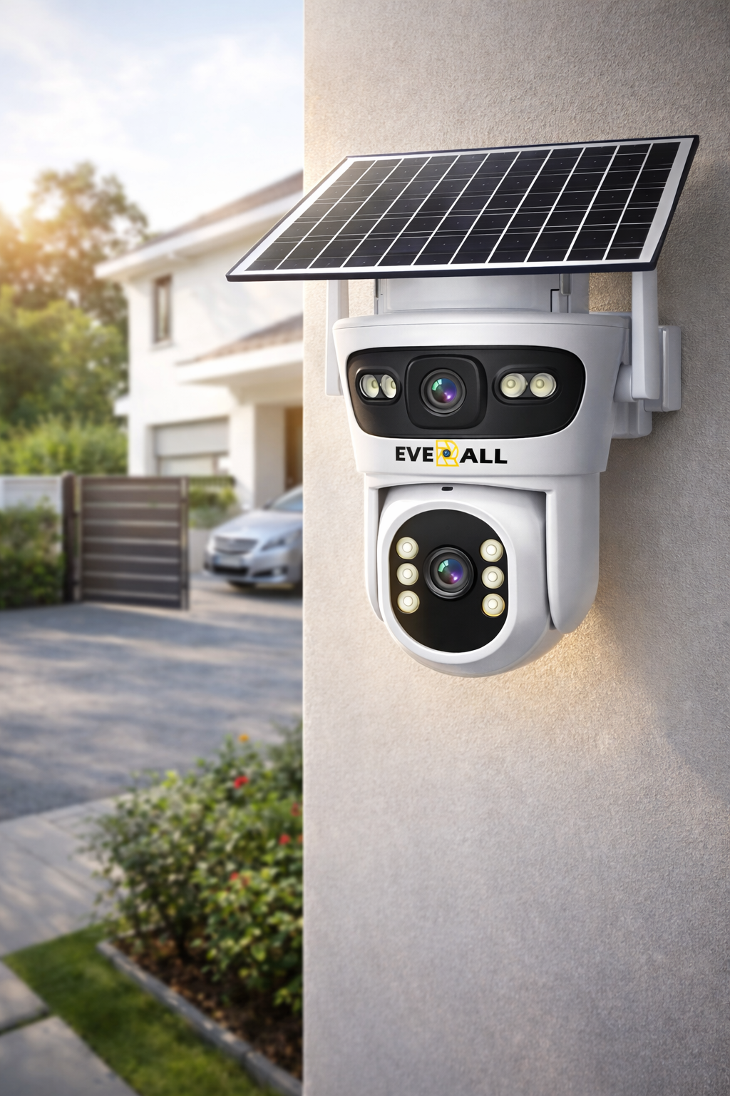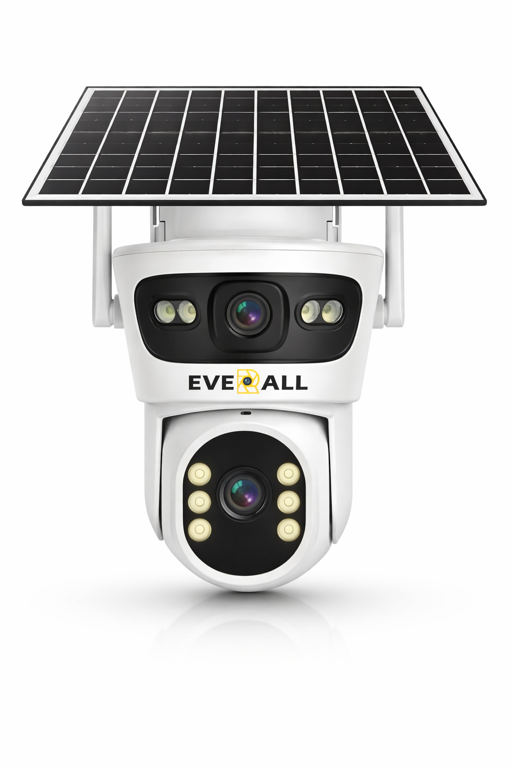 The Everall 6MP Dual Lens Solar SIM Outdoor CCTV Camera is a complete wireless security solution designed for outdoor and remote locations. Powered by a solar panel and supported by a 4G SIM card, this camera works without electricity or WiFi.