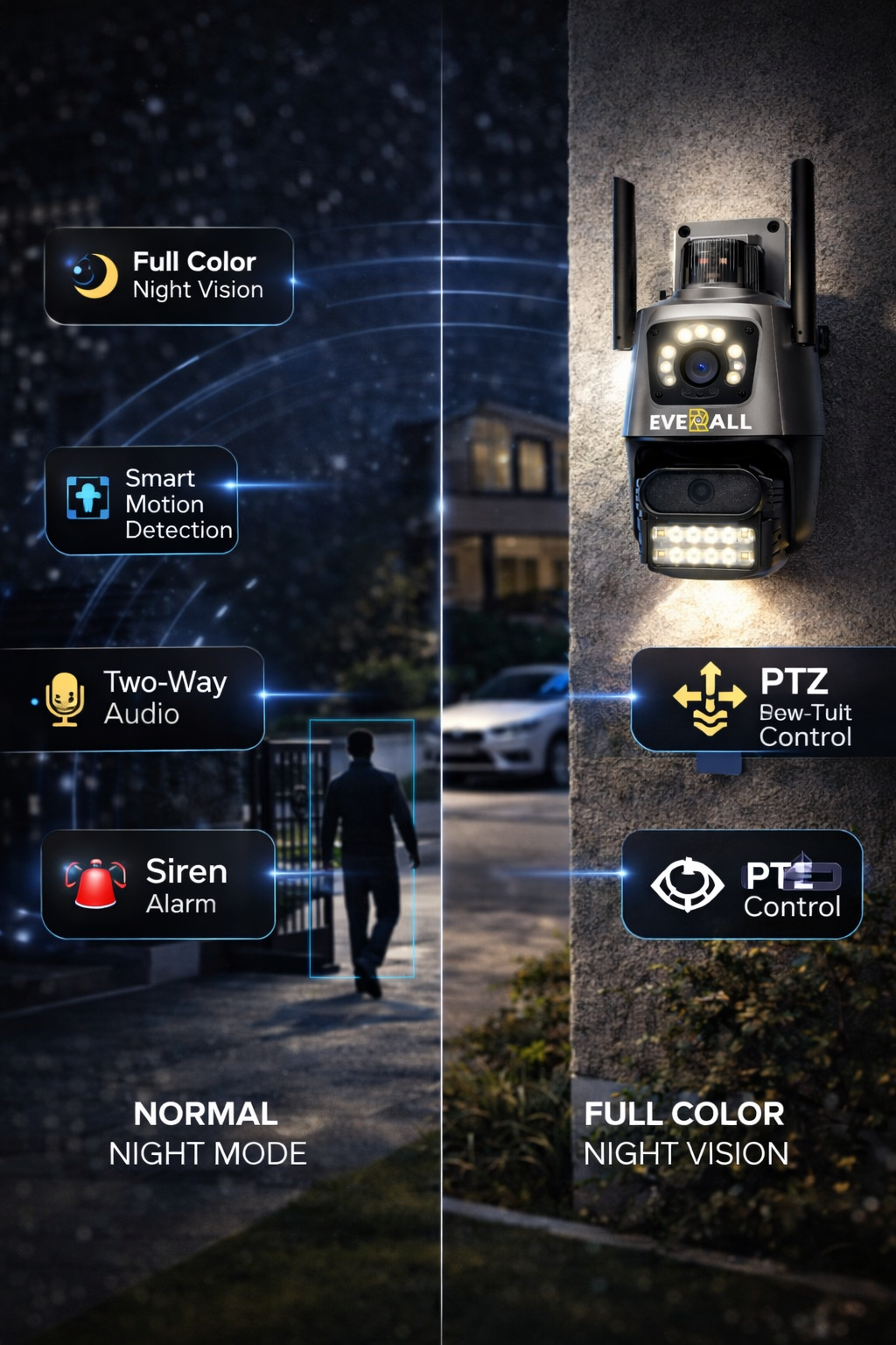 🌙 Night Color Vision + LED Lights – Clear night footage
